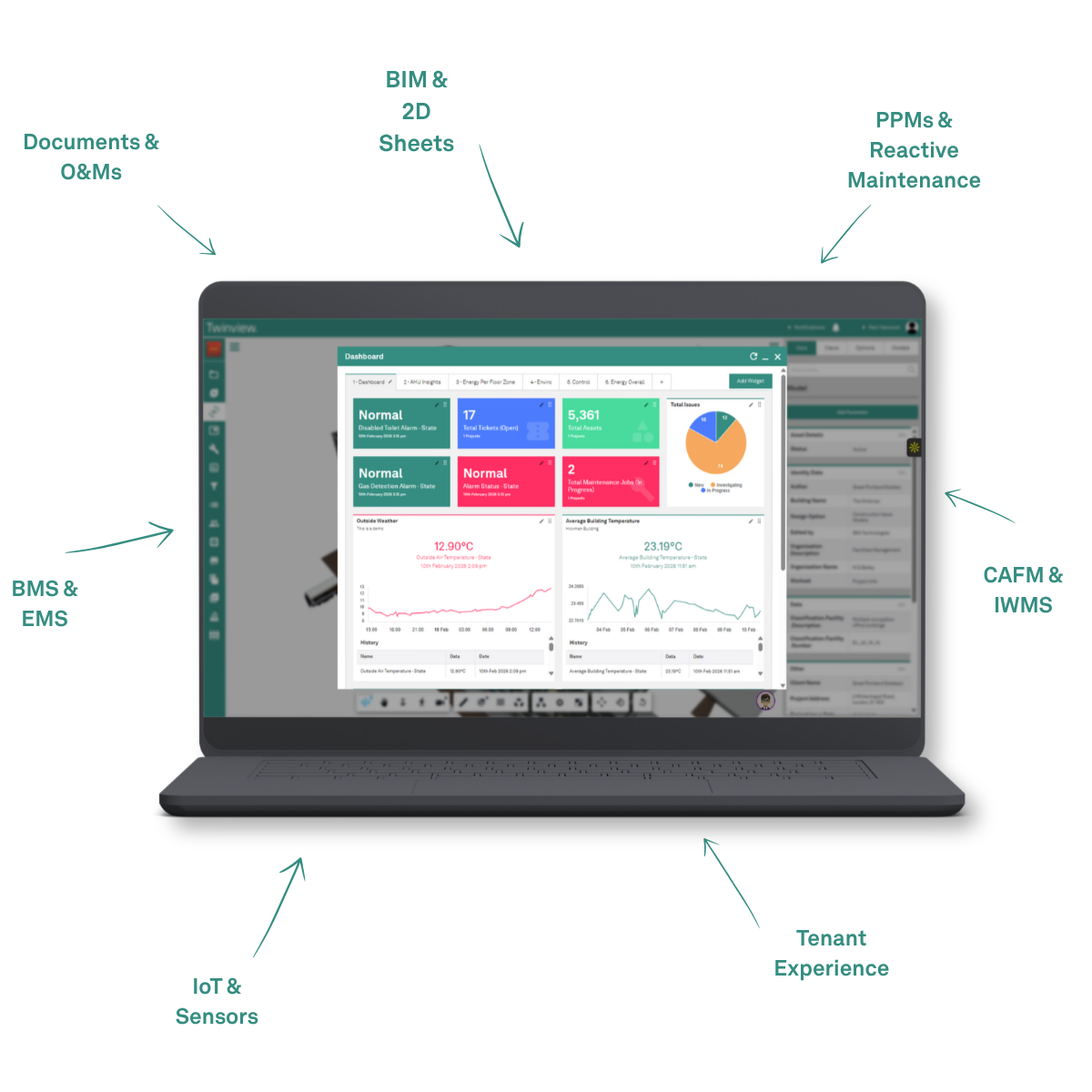 Connect to BMS, CAFM, BIM, IoT sensors and document systems. Twinview normalises and unifies data from any source.
