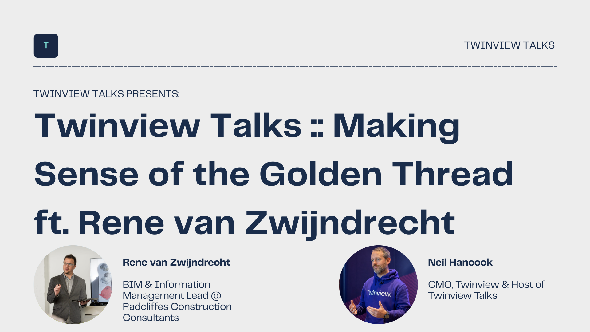 In this episode of Twinview Talks, we speak to Rene van Zwijndrecht, BIM & Information Management Lead at Radcliffes Construction Consultants, about how to make sense of the Golden Thread of Information and where people can start on their journey to achieving it.
